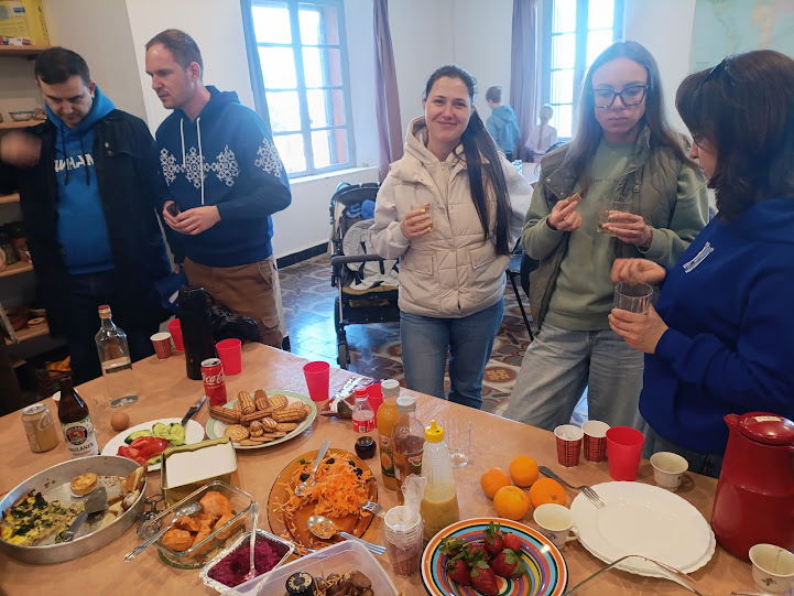 Nous sortons d’un repas partagé avec le personnel de l’ambassade de Russie venu visiter le monastère sur son temps de repos. Difficile de décrire ce qu’on ressent au cours de tous ces échanges spontanés, ce lieu est vraiment un laboratoire international où on côtoie toutes les cultures du monde en se sentant finalement très proches, on se prend à rêver d’un monde où les barrières n’existeraient plus. Quatre couples avec leurs enfants qui, s’ils ont souhaité un déjeuner partagé, n’en ont pas moins apporté deux sacs pleins de provisions que le carême demandera un peu de patience avant d’en profiter entièrement.