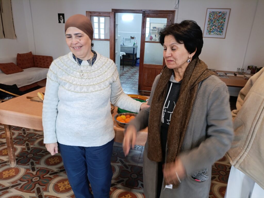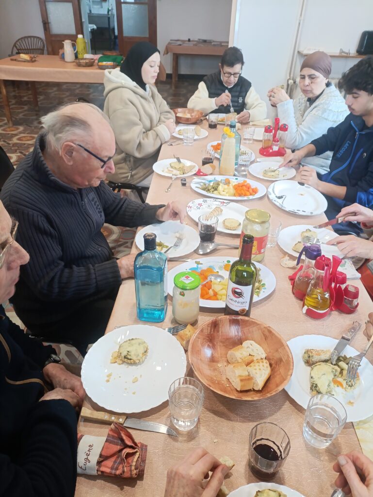 Salima et Bernard,un couple franco-algérien devenu ami depuis que nous leur avons apporté des tricots – donnés par une association sarthoise – pour leur association d’aide aux enfants, nous invitent pour passer la soirée. Ils habitent à quelques km, et nous nous réjouissons de cette perspective, à laquelle se joignent Brigitte et Clémence, notre chauffeur , qui connait parfaitement le secteur. Sauf qu’une véritable“ purée de pois “ en avait décidé autrement, et malgré la descente de Brigitte à chaque bifurcation, nous avons arpenté les environs et tourné en rond pendant une demie-heure. Quand nous arrivons dans leur belle et grande maison qui héberge également le grand -mère et des neveux, sans compter les amis de passage, le salon est garni pour l’apéro. Salima et Bernard nous font part de leurs activités auprès des jeunes: disciplines sportives, aide aux plus démunis, et des difficultés réglementaires pour maintenir une telle association. Dans la pièce à côté, un diner gargantuesque nous attend ( digne de la dinde de Noël ). Je ne me souviens pas avoir eu tant de mal à terminer mon assiette pourtant succulente. Merci en tous cas pour cette délicate attention à laquelle participaient également les neveux pour le service à table. Salima a un frère que nous avons retrouvé l’an dernier dans sa pizzéria à Tours, et viennent chaque année dans la Vendée natale de Bernard. La soirée ne devait pas s’arrêter là, la voiture a fait des siennes au retour, nous avons cru devoir rentrer à pied. ” Qui a dit qu’un mois au monastère devait être monotone ?