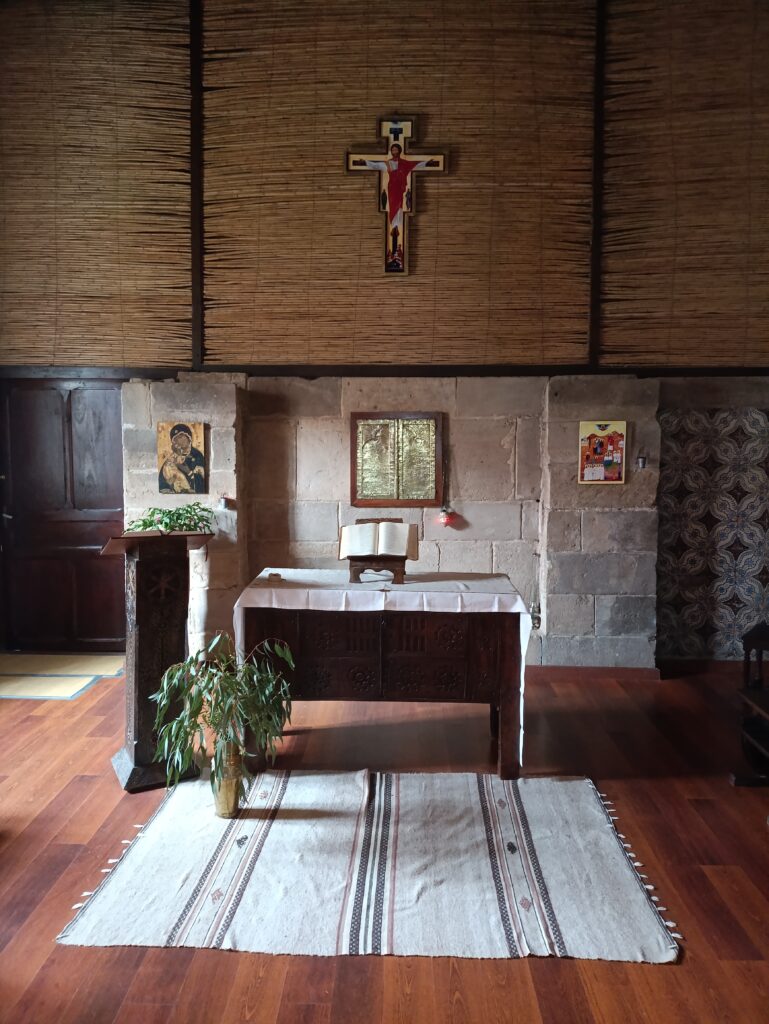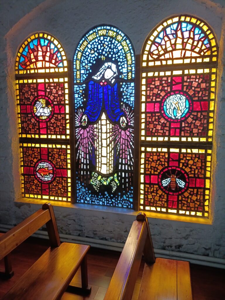 Quelques images du monastère le vitrail de la chapelle La où reposent les sept moines Les visiteurs de pressent derrière cette porte L’ancienne cuverie transformée en chapelle
